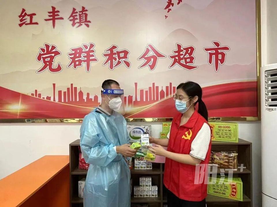 近日,连续做了3天志愿服务的全职妈妈彭德陕,从核酸检测引导岗位下来后,到镇的党群积分超市,用20个积分兑换了一瓶牛奶和一袋面包。面对此次疫情,阳东区红丰镇强化党建引领,充分发挥基层党组织的战斗堡垒和党员干部的先锋模范作用,借助“三共建”党员“双报到”机制,通过“阳东先锋”微信小程序发布信息以及联系区直单位、兄弟镇的方式,发动党员志愿者加入疫情防控一线,并依托党群积分超市,以参与志愿服务获取积分的形式,激发和调动党员志愿者参与疫情防控工作的积极性。(摄影师:冯美琪)