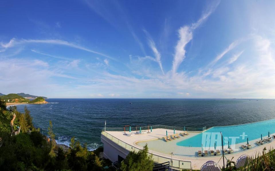 整个游泳池依靠着悬崖而建,从上空望下去颇具现代造型的泳池如一叶方舟般悬于崖上。泳池下方,涛声拍岸,崖上,碧波荡漾,水天一色,从此,你的心有了向往;从此,你的假日有了冲动。(摄影师:谭云勇)